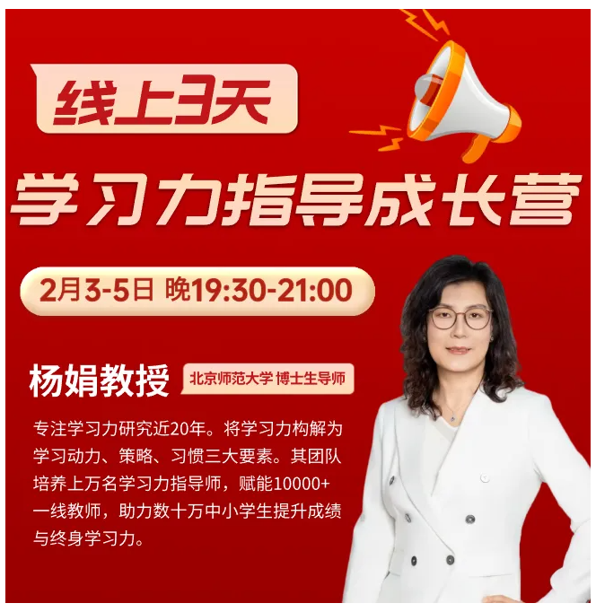 别犹豫了!2月3日,重磅福利来袭——北师大杨娟教授线上学习力指导成长营正式开营,全程直播讲解,专属教培人、家长的成长解药!