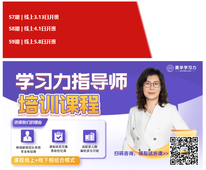 由北京师范大学杨娟教授领衔团队研发的学习力指导师培训第57期、58期、59期同步招生中。提前锁定名额,抢占教育转型红利期,成为专业的学习力引路人。