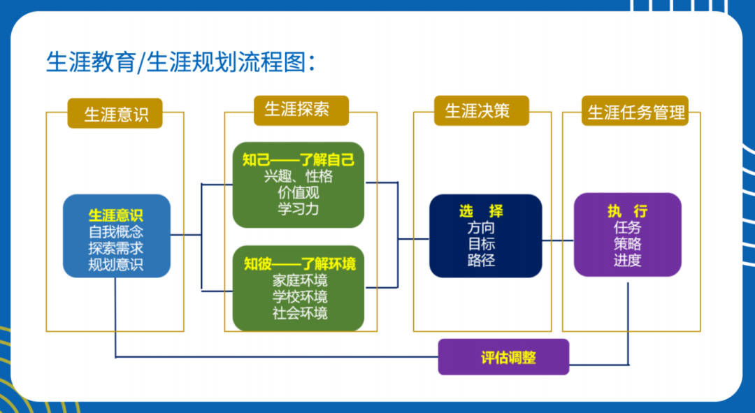 他首先展示了生涯规划流程图,以可视化方式呈现从自我探索、目标设定到路径选择、动态调整的全流程,让在场教师清晰掌握规划的核心步骤。