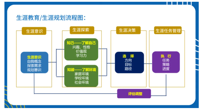 他首先展示了生涯规划流程图,以可视化方式呈现从自我探索、目标设定到路径选择、动态调整的全流程,让在场教师清晰掌握规划的核心步骤。