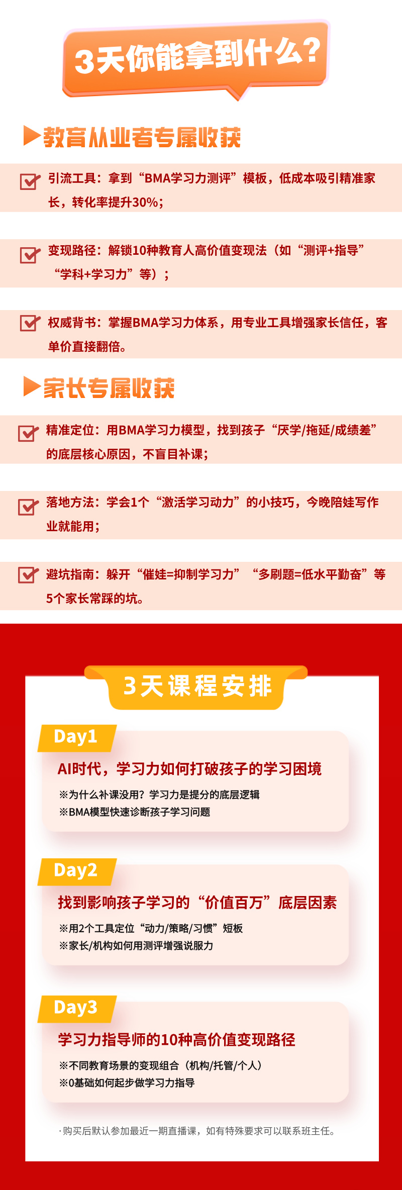 全链条实战赋能,拒绝空洞理论输出,为学员提供可直接落地的课程体系模板、获客转化策略,帮机构打造差异化竞争力;搭配真实案例解析,手把手教你科学辅导,真正实现“学完就用,用了见效”。