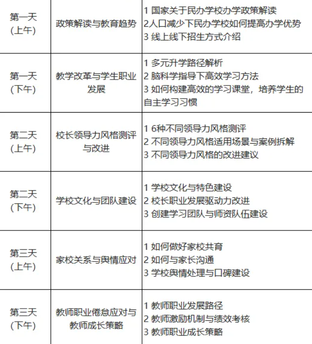 多维提升:从政策研判、个人领导力,到学校管理、实战方法落地,多维度赋能校长成长,助力适配新时代教育管理新要求。