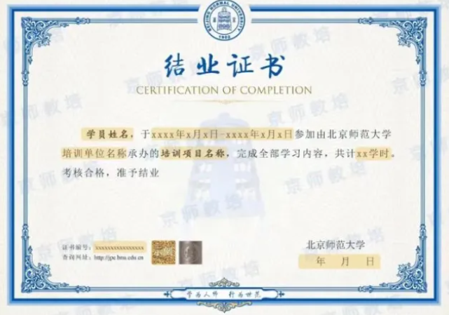 完成全部课程学习并考核合格后,将获得北京师范大学官方颁发的培训结业证书,证书可在学校培训管理信息平台查验,为你的职业发展增添权威背书,助力个人与学校共同成长。
